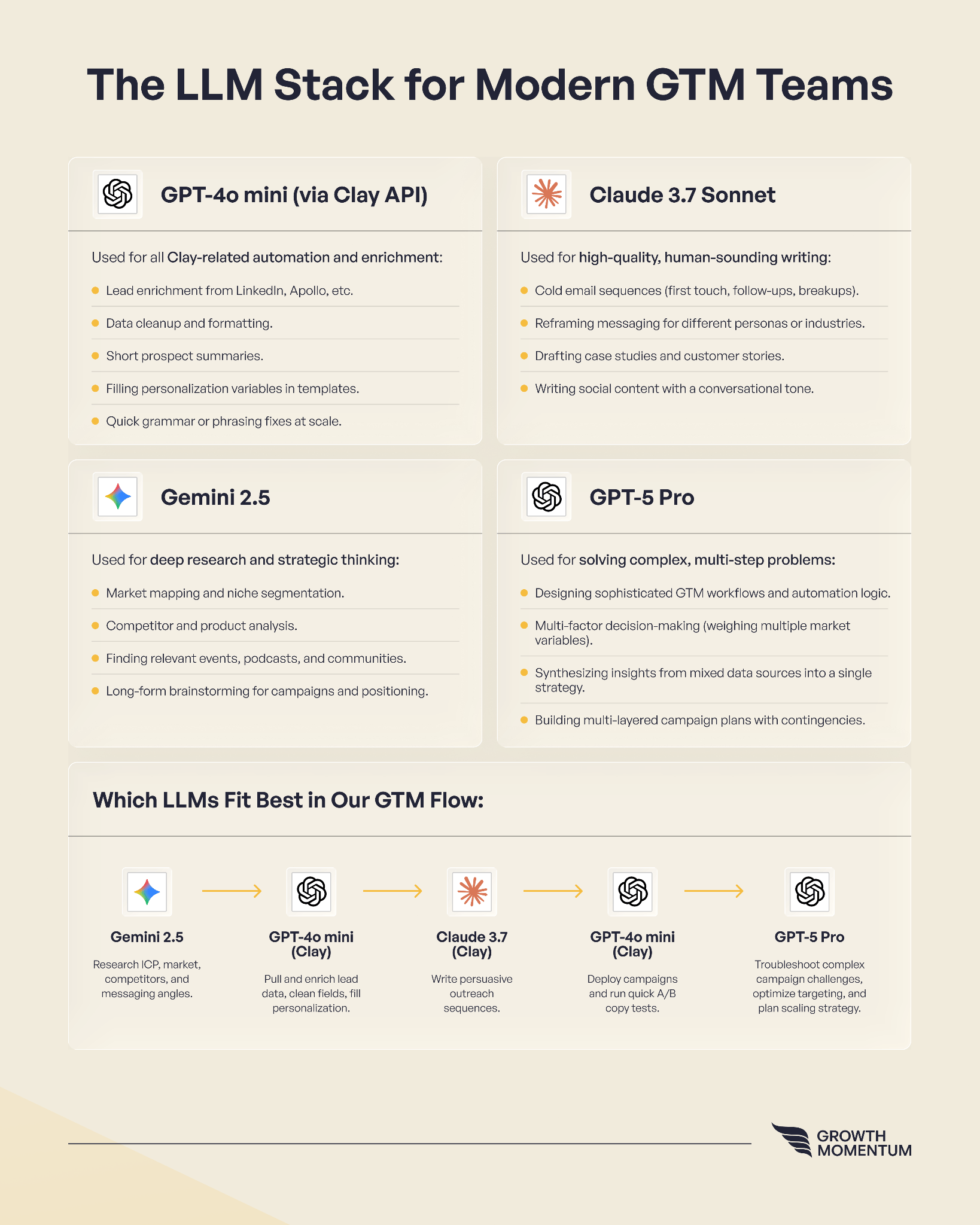 That’s where 4o mini works best. You can call it multiple times inside Clay without thinking about cost or delay. It runs through the small steps that keep your system alive.